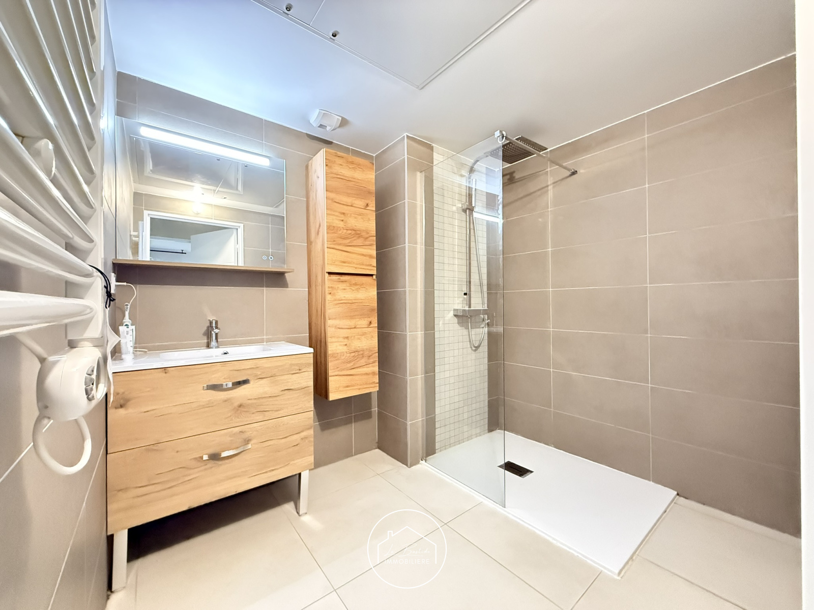 Menuiseries en aluminium, domotique pour les volets roulants ainsi que la pompe à chaleur réversible, porte blindée et placards équipés : tout a été pensé pour optimiser le confort des occupants.