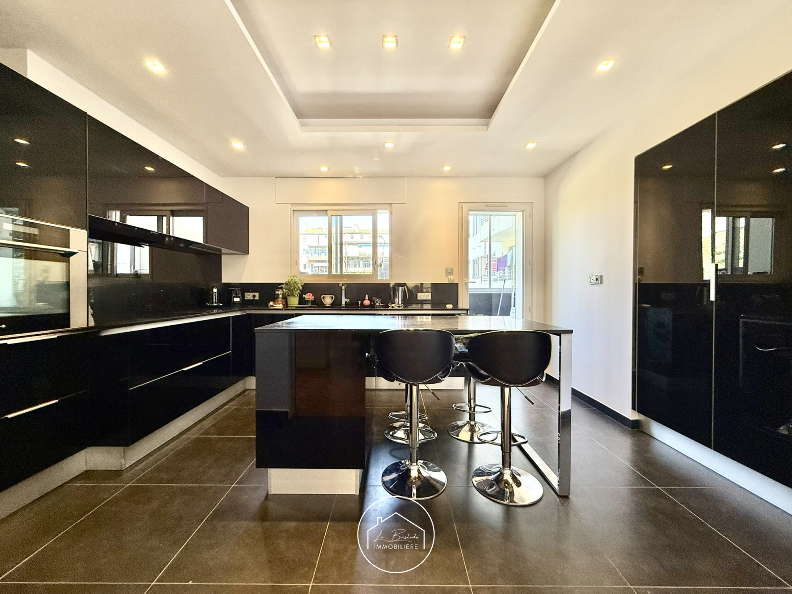 La cuisine de 15 m², moderne et parfaitement équipée, s’intègre dans une ambiance chaleureuse et contemporaine. Elle peut être séparée du séjour par des portes à galandage, permettant de moduler l’espace selon vos envies. À l’arrière, une loggia offre un espace buanderie pratique et fonctionnel.