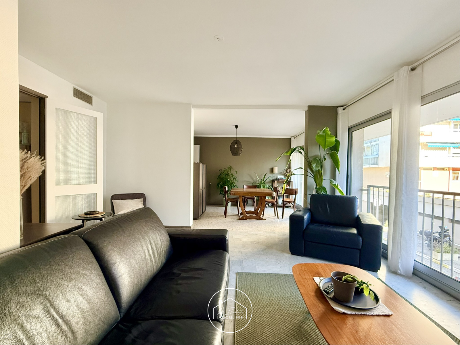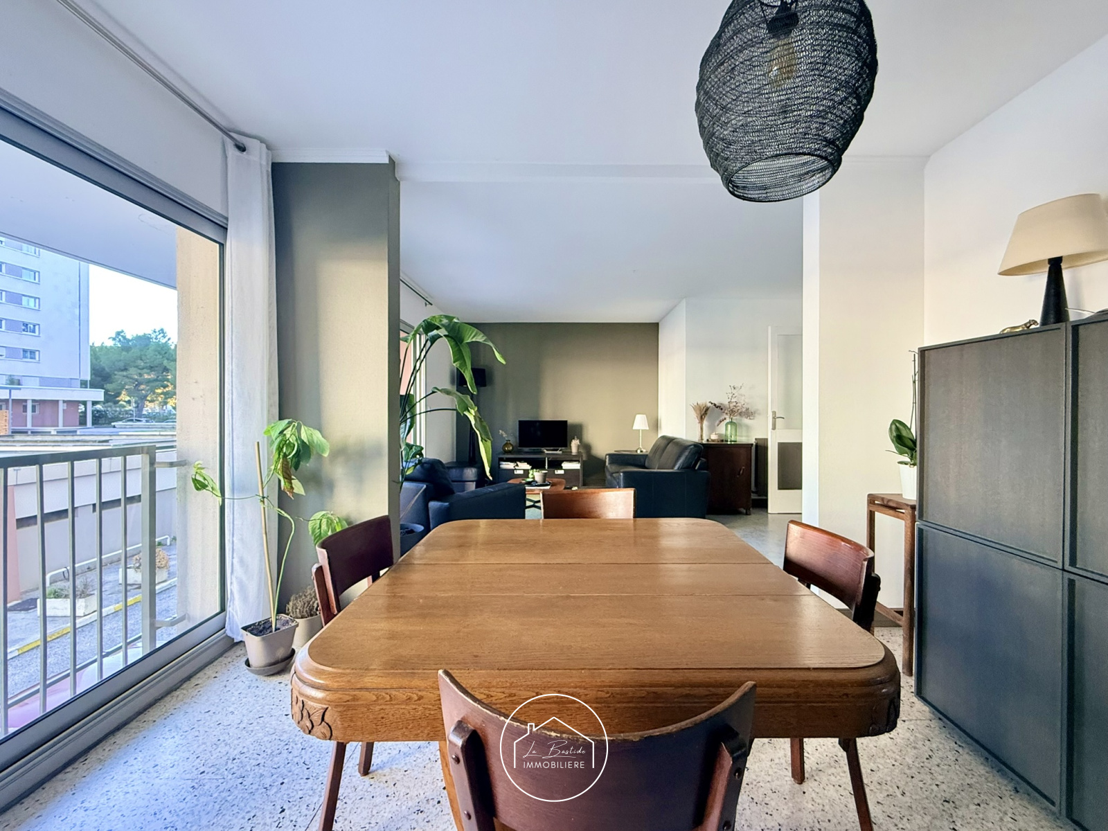 D’une surface de 97 m², l’appartement offre une distribution fonctionnelle et très agréable à vivre. L’entrée mène vers un vaste double séjour, composé d’un salon et d’une salle à manger formant un bel espace de vie convivial. La cuisine séparée, récemment rénovée, bénéficie d’un cellier attenant, idéal pour le rangement et l’organisation du quotidien.